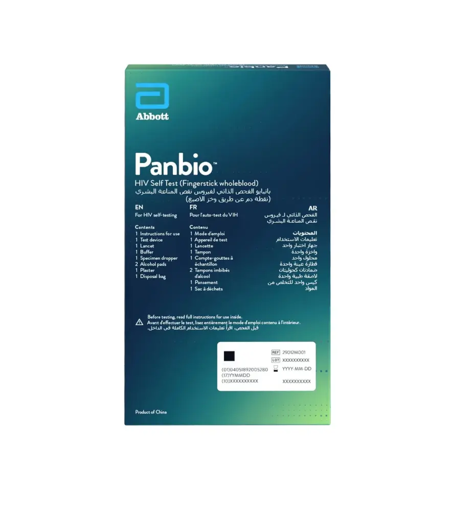 بانبايو™ الفحص الذاتي لفيروس نقص المناعة البشري (نقطة دم عن طريق وخز الإصبع) هو اختبار منزلي يستخدم مرة واحدة يعتمد على عينة صغيرة من الدم يتم الحصول عليها من وخز الإصبع باستخدام ابرة الوخز المرفقة داخل العبوة.